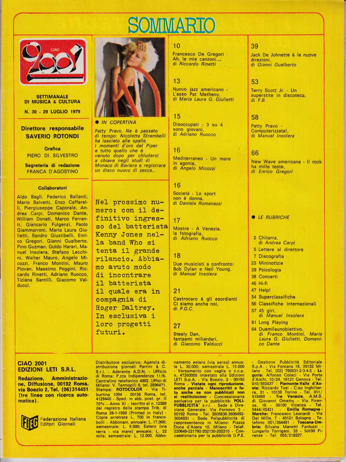 | Titolo: | Rivista Ciao 2001 n. 30 del 29 Luglio 1979 – In copertina Patty Pravo |