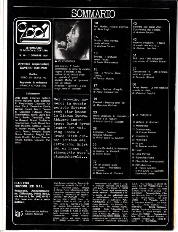 | Titolo: | Rivista Ciao 2001 n. 40 del 7 Ottombre 1979 – In copertina Bob Marley |