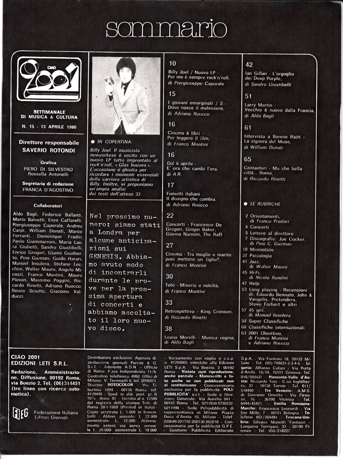 | Titolo: | Rivista Ciao 2001 n. 15 del 13 Aprile 1980 – In copertina Billy Joel |