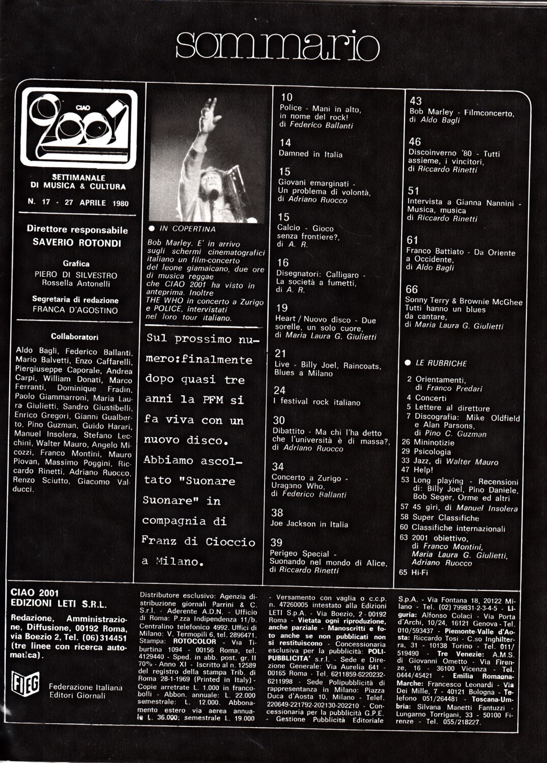 | Titolo: | Rivista Ciao 2001 n. 17 del 27 Aprile 1980 – In copertina Bob Marley |