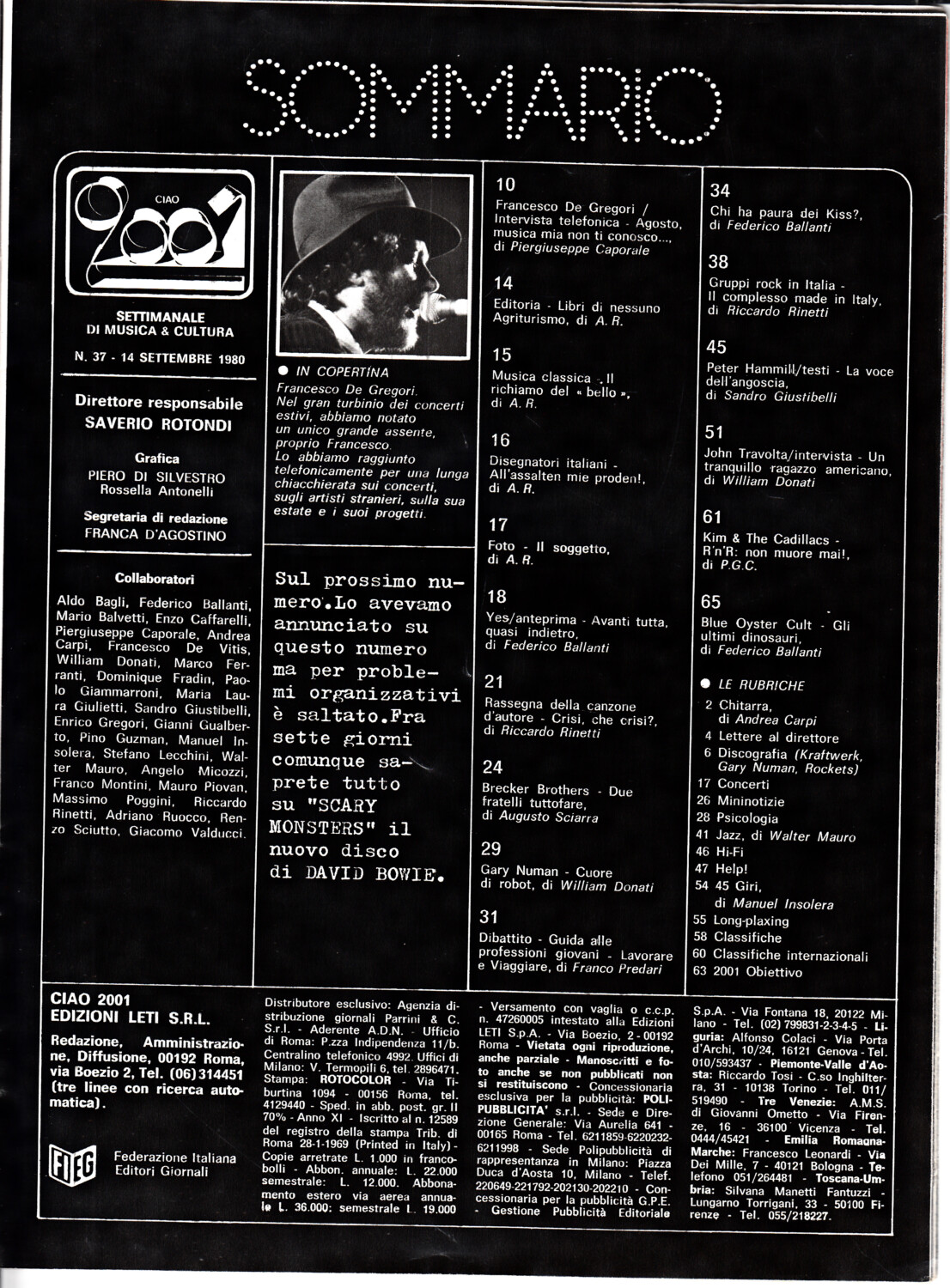 | Titolo: | Rivista Ciao 2001 n. 37 del 14 Settembre 1980 – In copertina Francesco De Gregori |