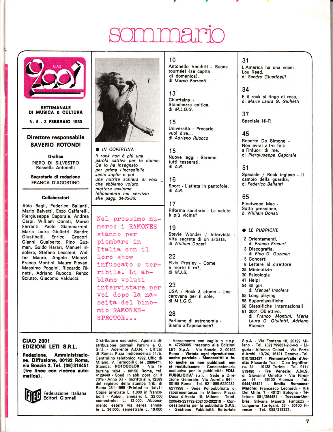 | Titolo: | Rivista Ciao 2001 n. 5 del 3 Febbraio 1980 – In copertina Janis Joplin |