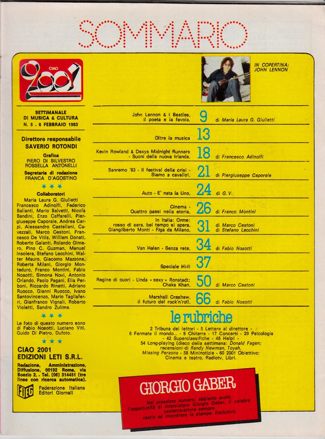 | Titolo: | Rivista Ciao 2001 Anno 1983 n. 5 del 6 Febbraio – In copertina John Lennon |