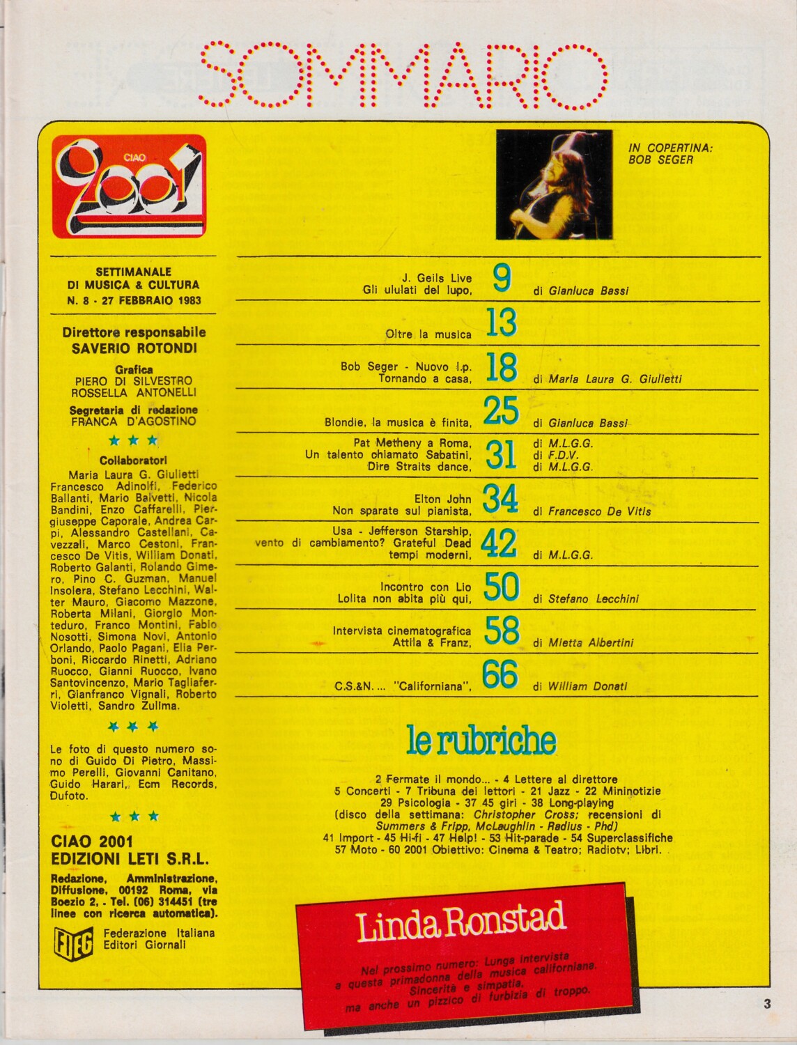 | Titolo: | Rivista Ciao 2001 Anno 1983 n. 8 del 27 Febbraio – In copertina Bob Seger |