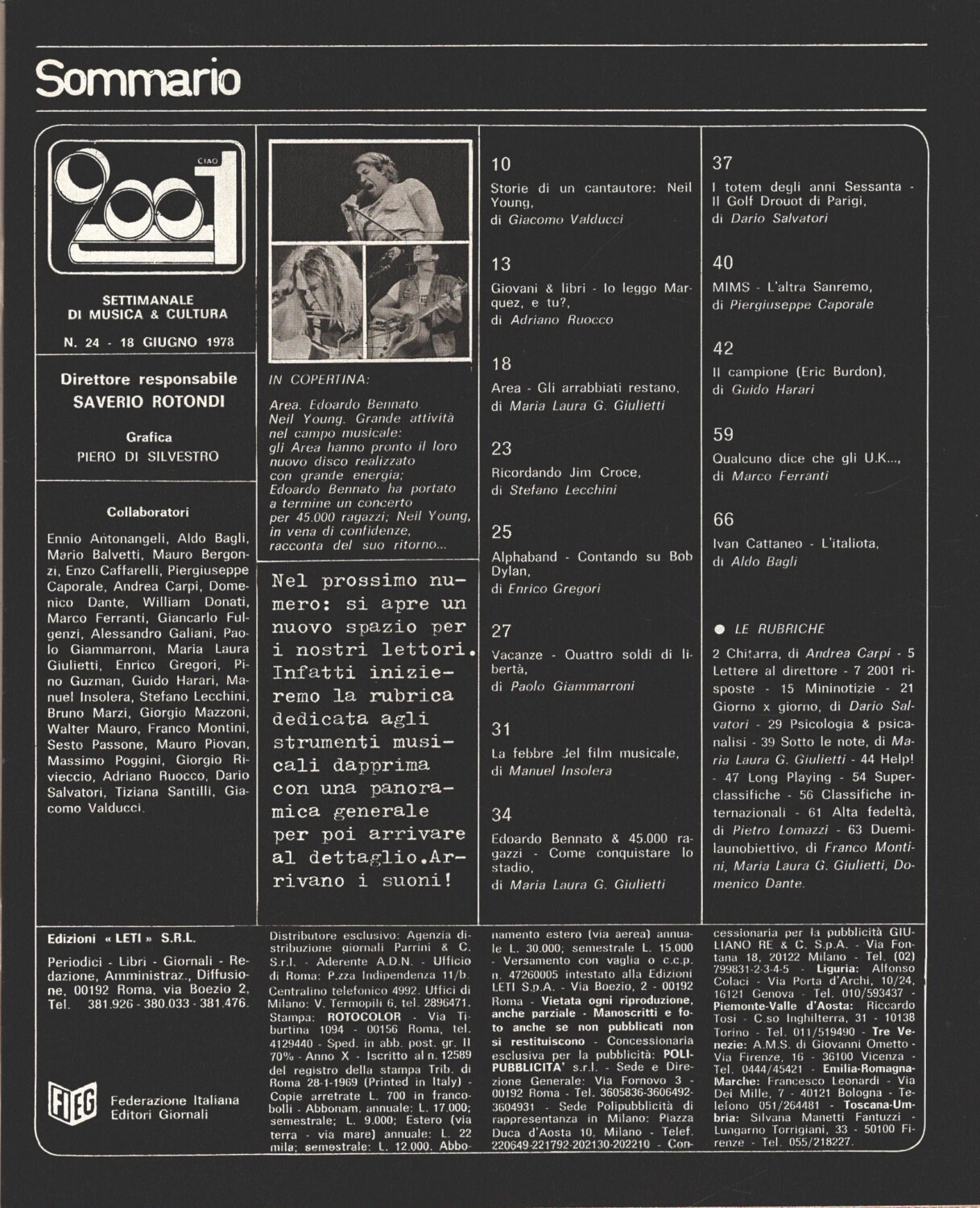 | Titolo: | Rivista Ciao 2001 n. 24 del 18 Giugno 1978 – In Copertina Area, Edoardo Bennato, Neil Young |