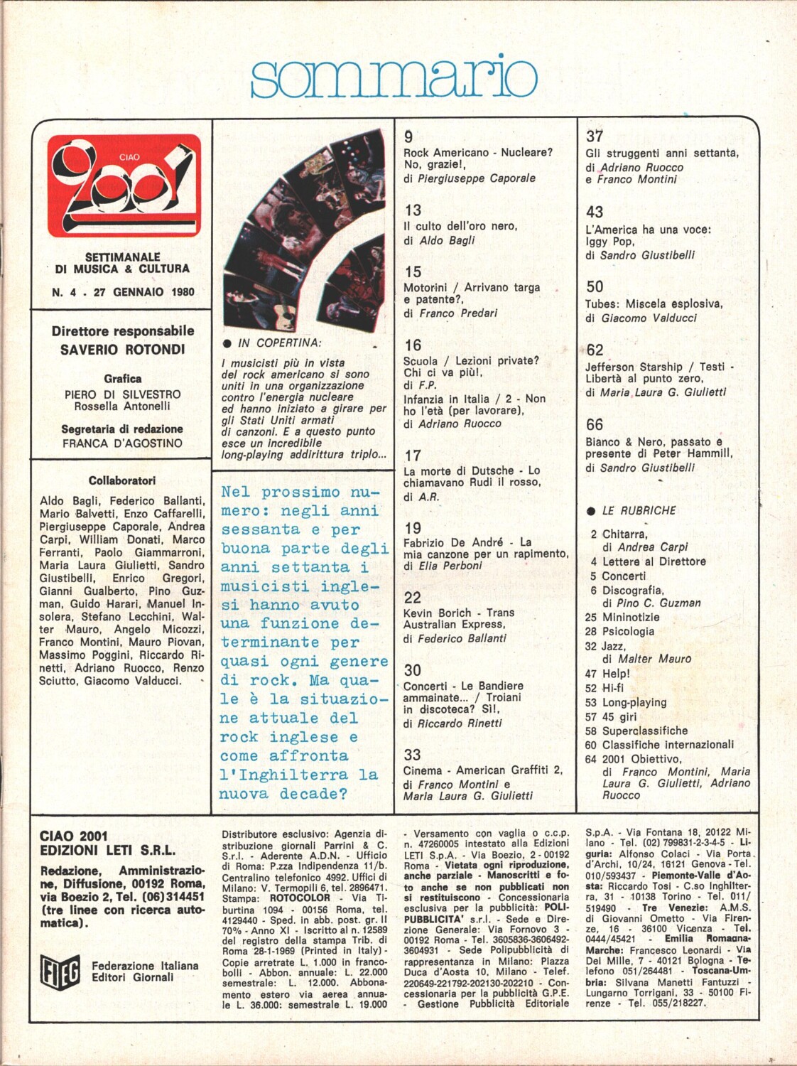 Rivista Ciao 2001 n. 4 del 27 Gennaio 1980 – In Copertina Rock USA No all’Atomica