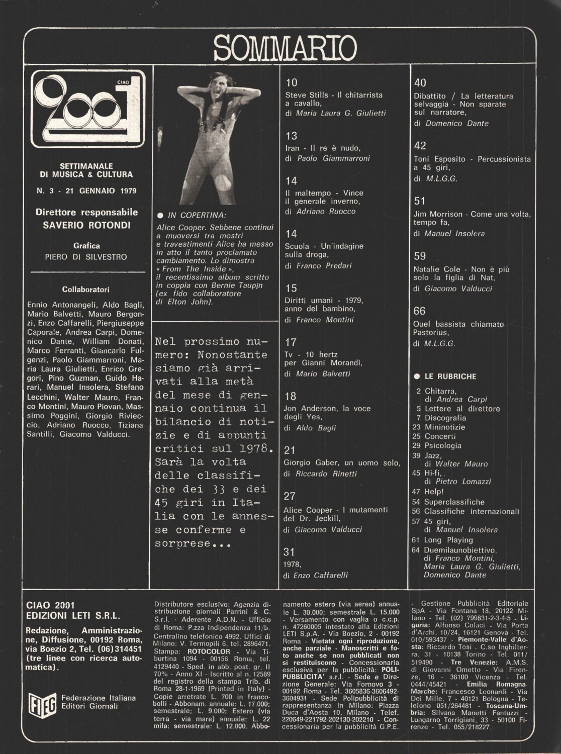 | Titolo: | Rivista Ciao 2001 n. 3 del 21 Gennaio 1979 – In Copertina Alice Cooper |