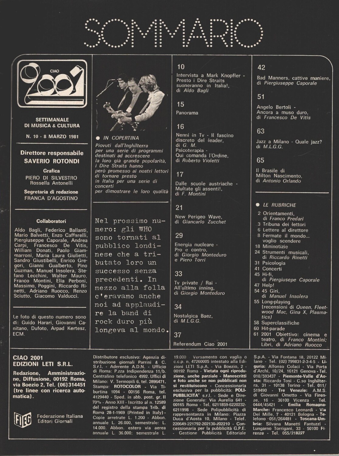 Rivista Ciao 2001 n. 10 del 8 Marzo 1981 – In Copertina Dire Straits