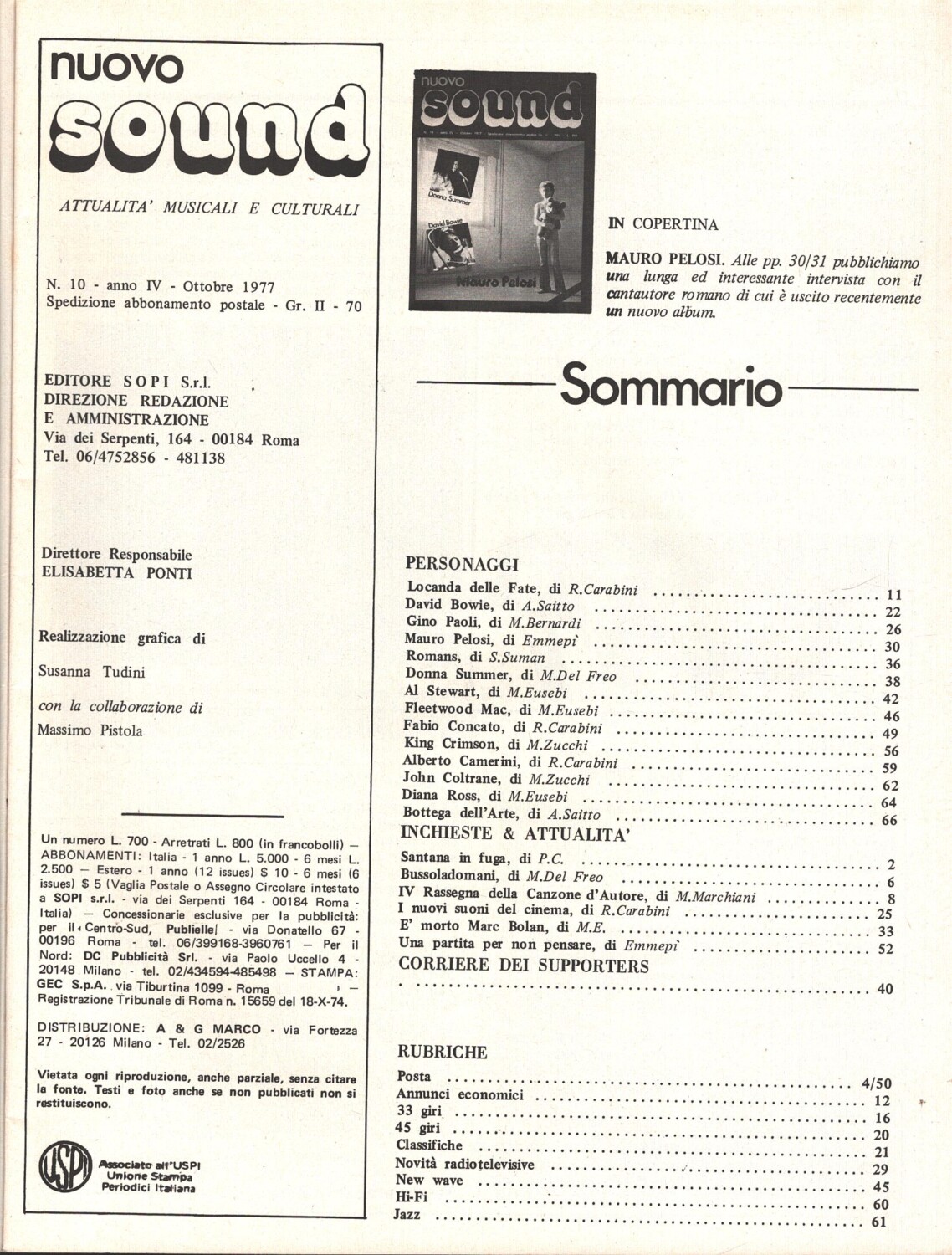 | Titolo: | Rivista Nuovo Sound n. 10 – Ottobre 1977 – In Copertina Mauro Pelosi |