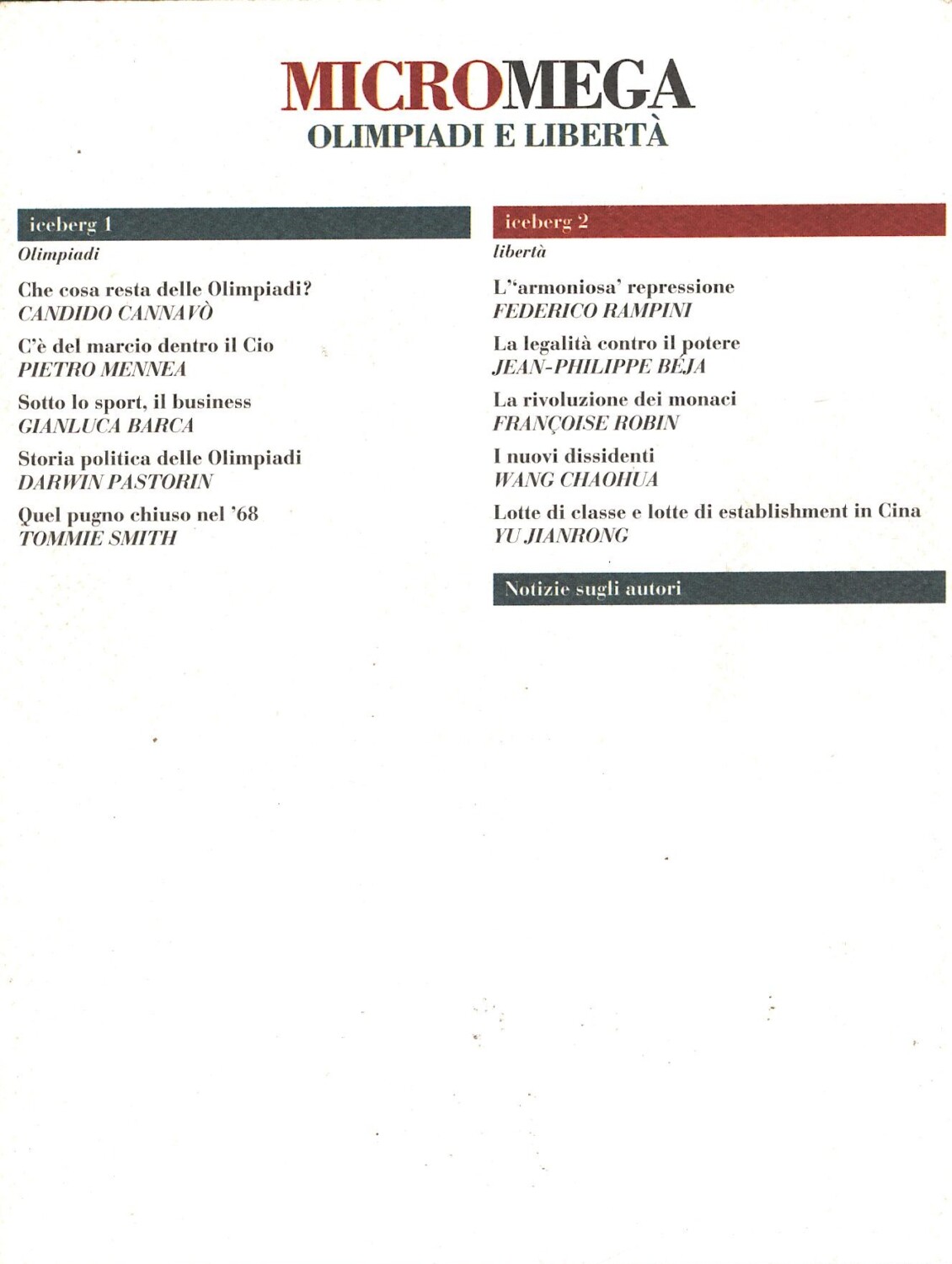 | Titolo: | Rivista Micromega Olimpiadi e Libertà – Supplemento al n. 4/08 (2008) di AA.VV. ed. Editrice Periodici Culturali |