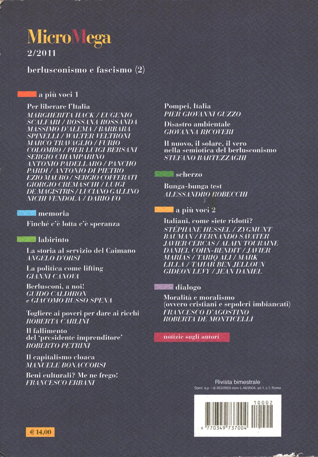 | Titolo: | Rivista Micromega 2/2011 – Berlusconismo e Fascismo (2) di AA.VV. ed. L’Espresso |