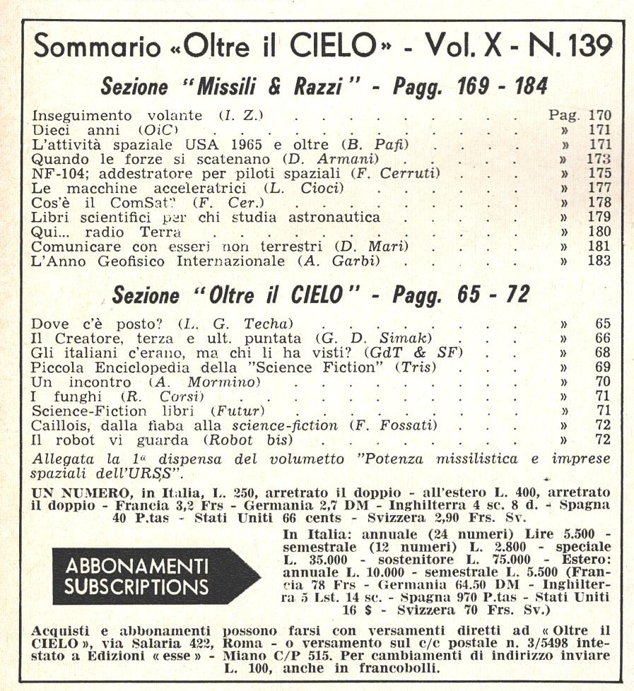 | Titolo: | Rivista Oltre il Cielo n. 139 – Febbraio 1966 ed. Esse |