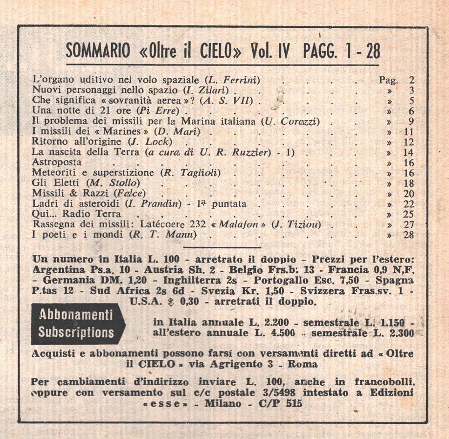 Rivista Oltre il Cielo n. 61 del 1-15 Giugno 1960 ed. Esse