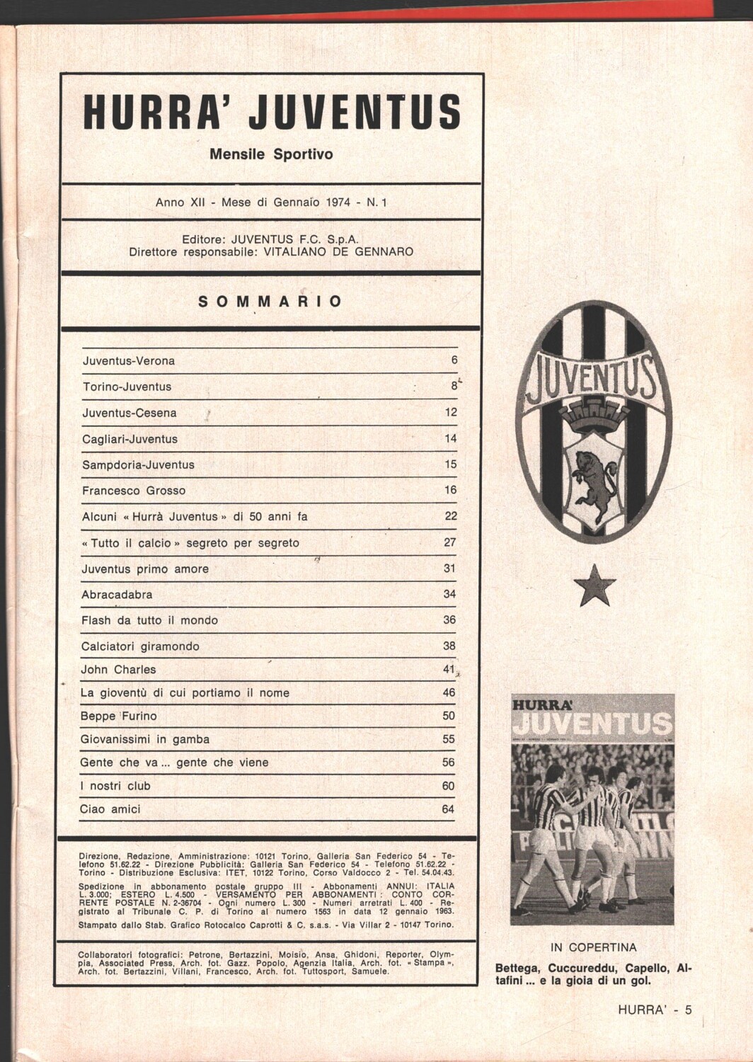 | Titolo: | Hurrà Juventus n. 1 – Gennaio 1974 – In copertina Bettega, Cuccureddu, Capello, Altafini |