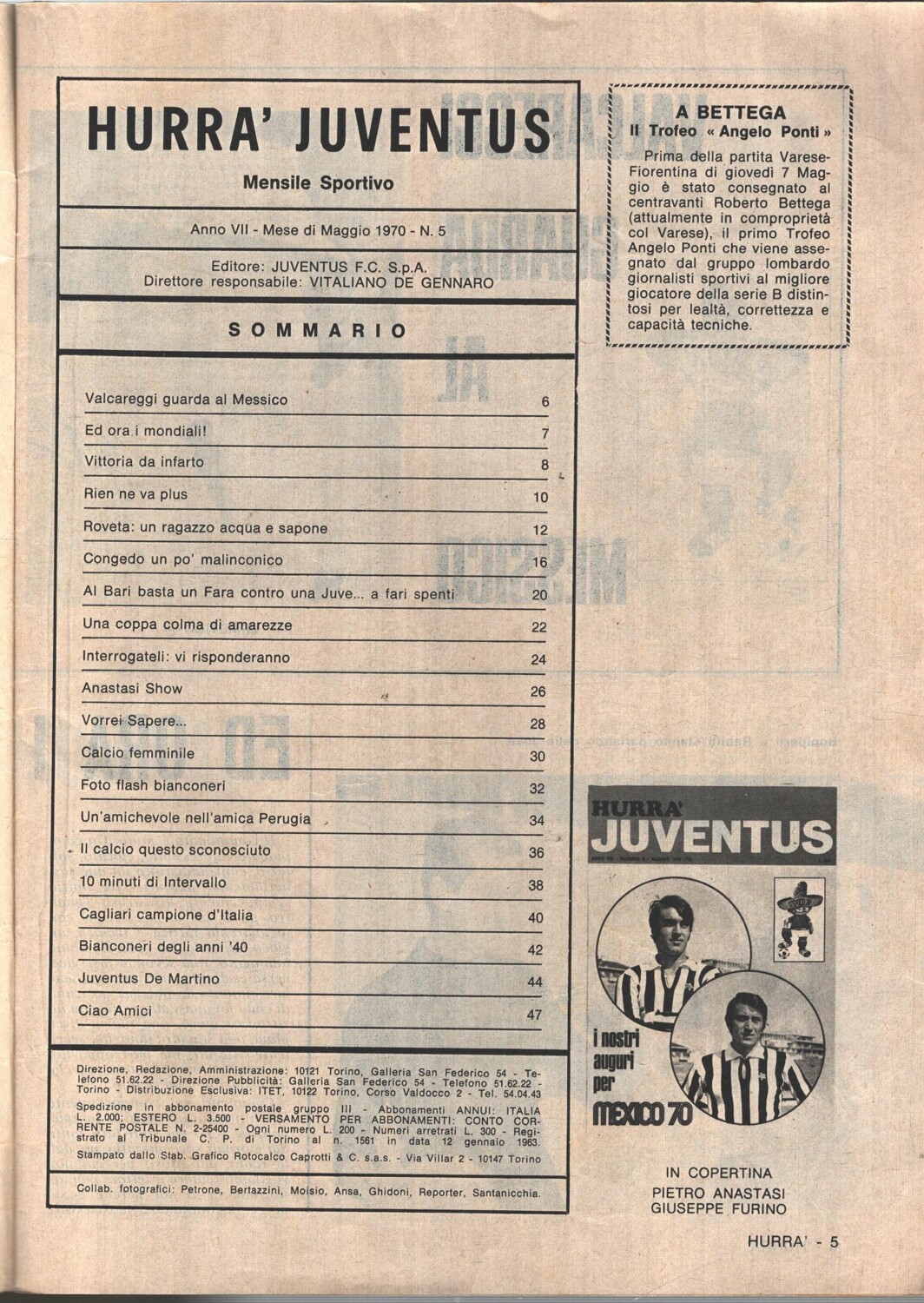 | Titolo: | Hurrà Juventus n. 5 – Maggio 1970 – In copertina Anastasi, Furino |