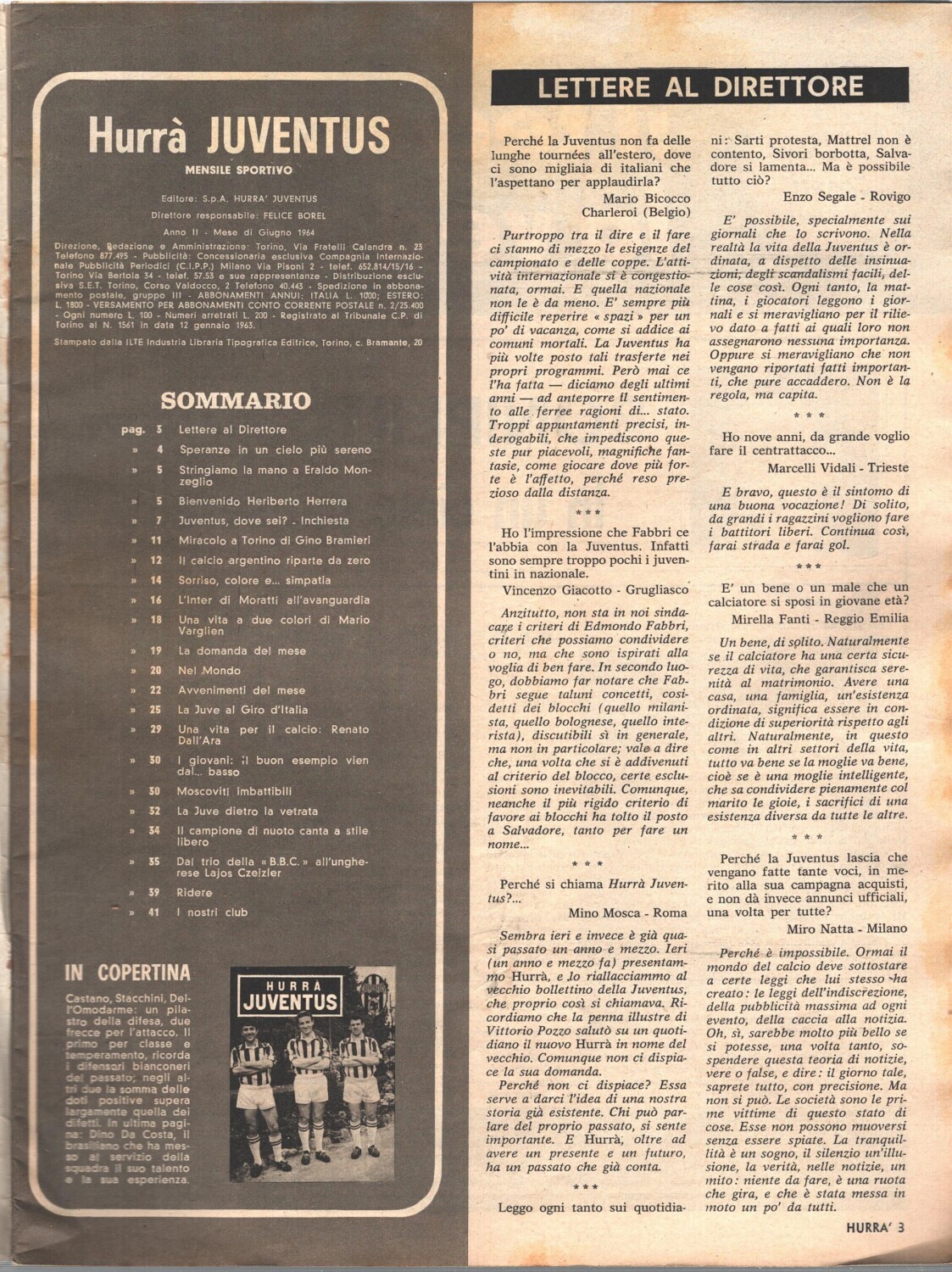 | Titolo: | Hurrà Juventus n. 6 – Giugno 1964 – In copertina Castano, Stacchini, Dell’Omodarme |