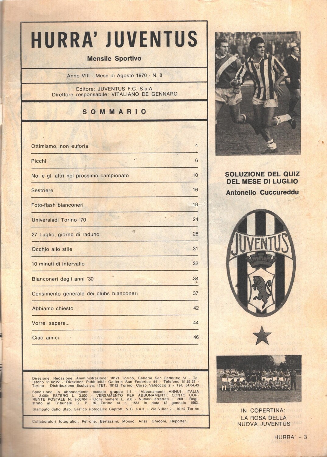 | Titolo: | Hurrà Juventus n. 8 – Agosto 1970 – In copertina La rosa della Juventus |