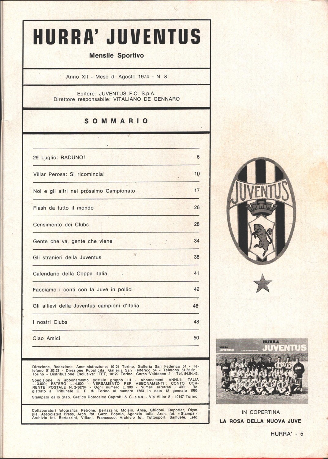 | Titolo: | Hurrà Juventus n. 8 – Agosto 1974 – In copertina La rosa della nuova Juve |