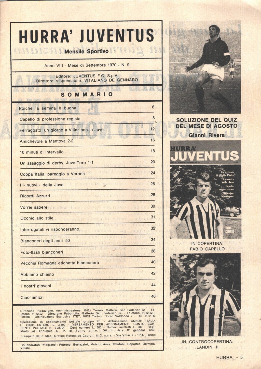 | Titolo: | Hurrà Juventus n. 9 – Settembre 1970 – In copertina Fabio Capello |