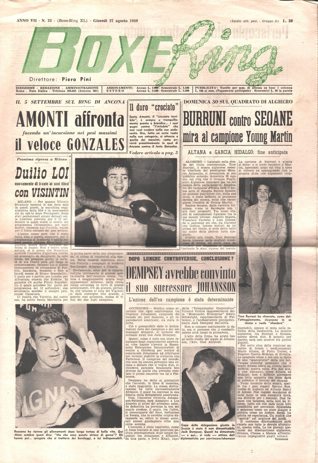 | Titolo: | Rivista Boxe Ring anno VII n. 33 – 27 Agosto 1959 |