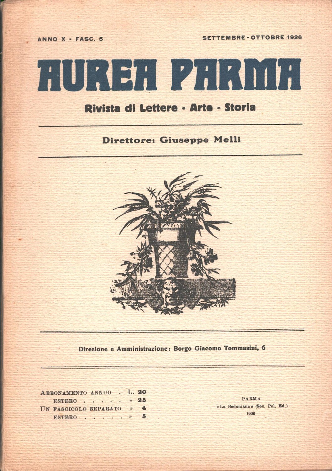 | Titolo: | Rivista Aurea Parma – Anno X Fascicolo 5 – Settembre Ottobre 1926 ed. La Bodoniana |