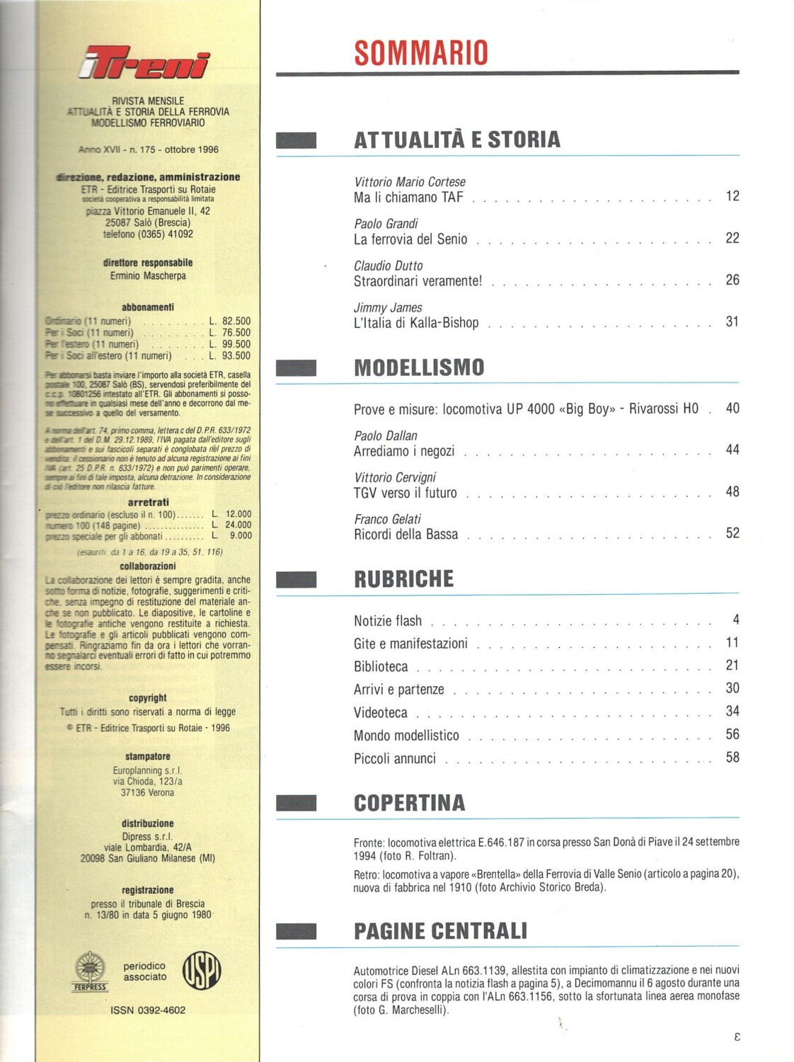 Rivista I Treni anno XVII n. 175 – Ottobre 1996