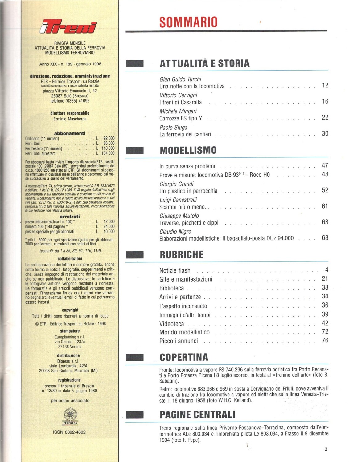 | Titolo: | Rivista I Treni anno XIX n. 189 – Gennaio 1998 |