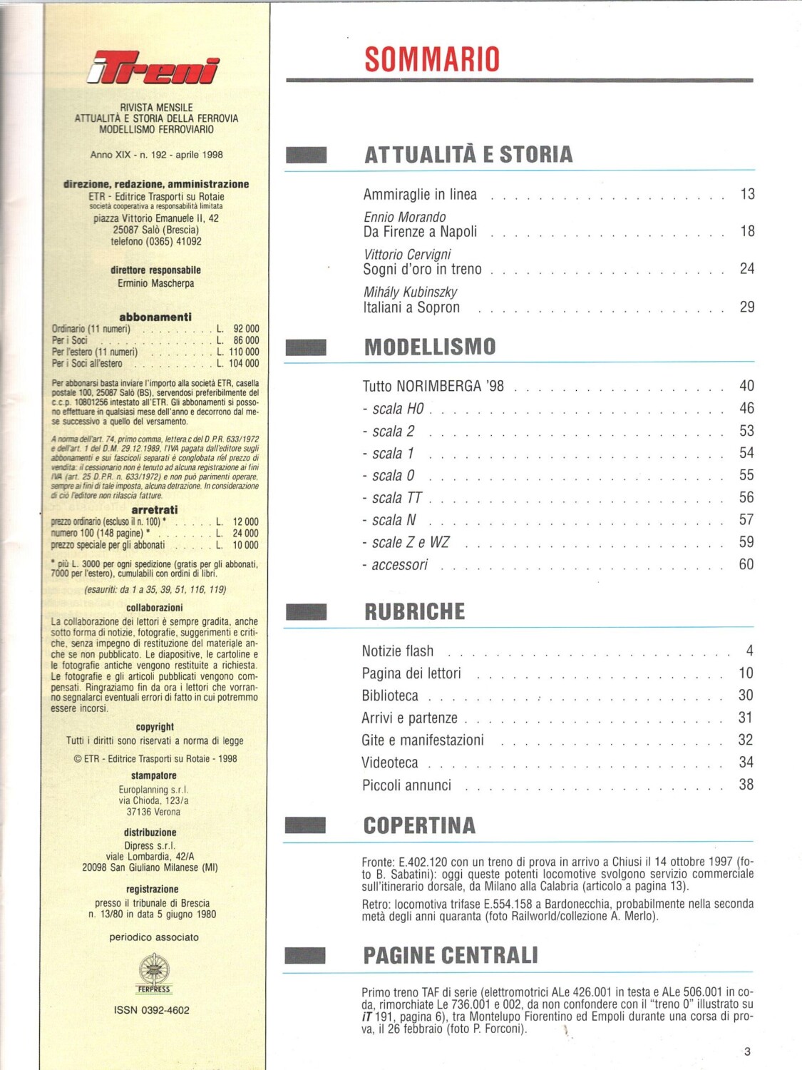 | Titolo: | Rivista I Treni anno XIX n. 192 – Aprile 1998 |