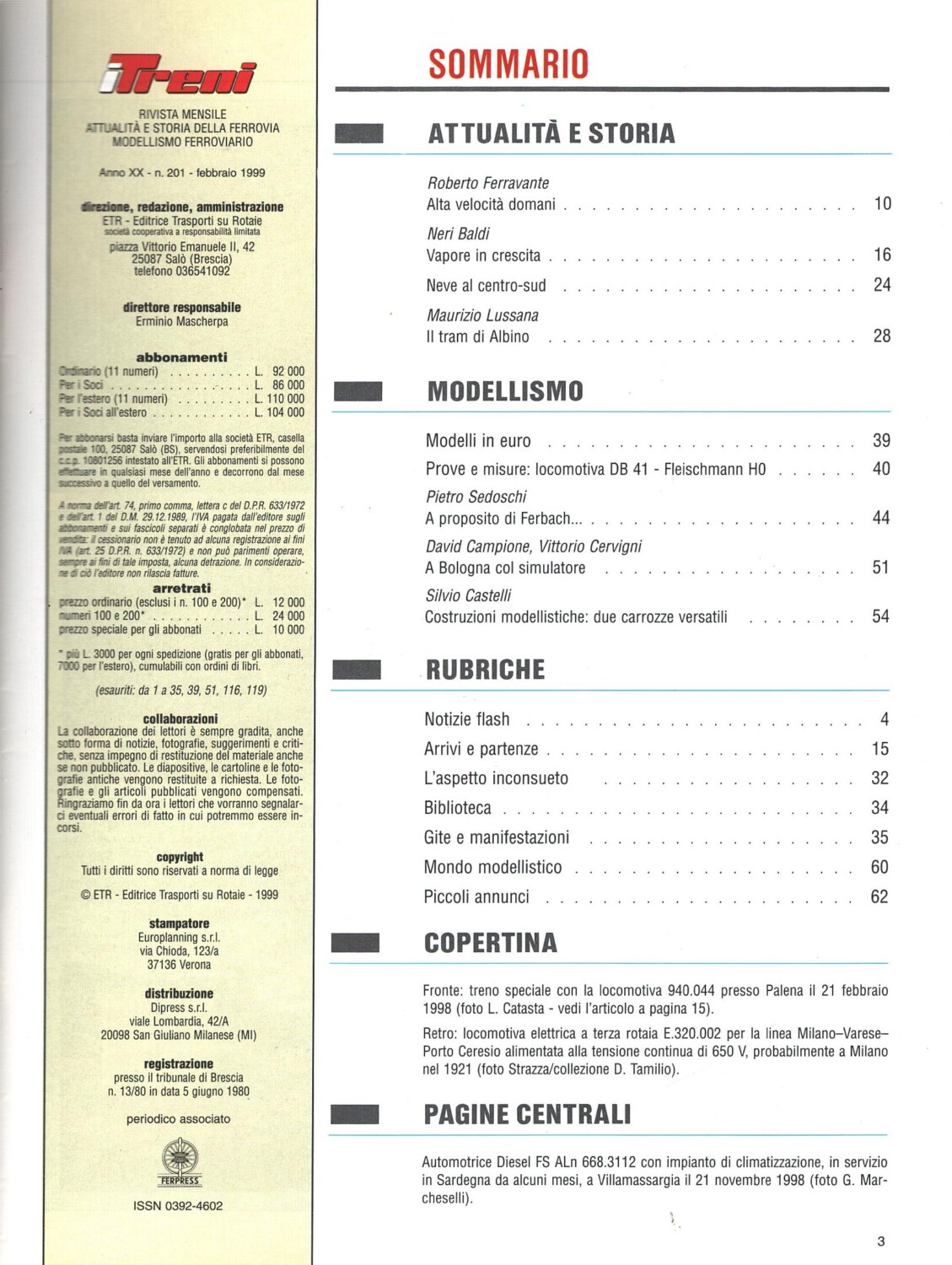 | Titolo: | Rivista I Treni anno XX n. 201 – Febbraio 1999 |