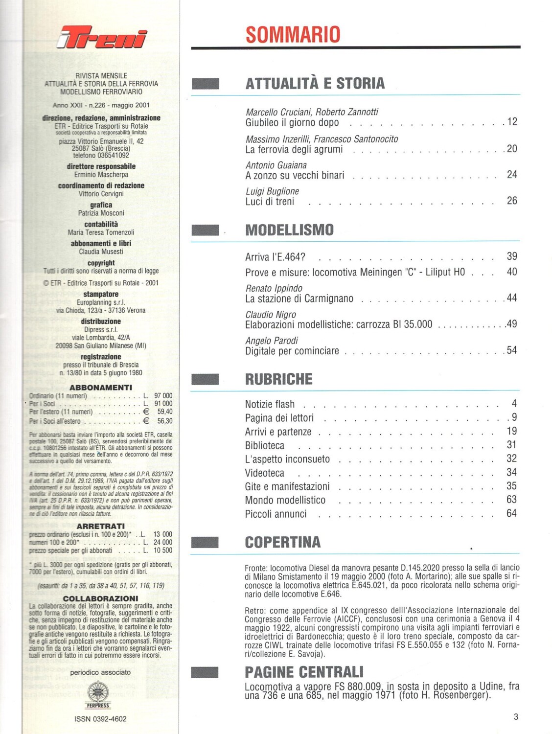 | Titolo: | Rivista I Treni anno XXII n. 226 – Maggio 2001 |