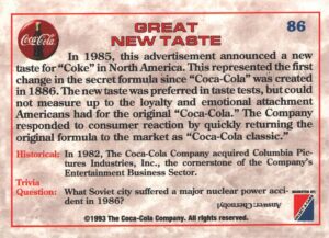 Coca-Cola CollezionismoCard Coca-Cola USA n. 86 – Great New Taste 1985 – Trivia Card 1993 ed. Marketed