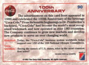 Coca-Cola CollezionismoCard Coca-Cola USA n. 90 – 100th Anniversary 1986 – Trivia Card 1993 ed. Marketed