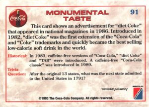 Coca-Cola CollezionismoCard Coca-Cola USA n. 91 – Monumental Taste 1986 – Trivia Card 1993 ed. Marketed