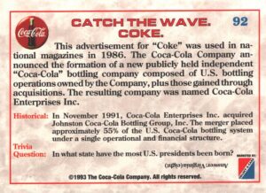 Coca-Cola CollezionismoCard Coca-Cola USA n. 92 – Catch the wave Coke 1986 – Trivia Card 1993 ed. Marketed