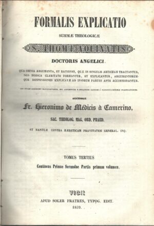 Formalis explicatio Summae Theologicae S. Tomae Aquinatis (vol. 3) di Gieronimo De Medicis – In Latinto ed. Soler Fratres (1859)